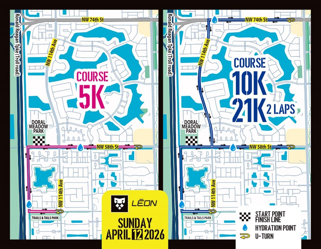 Ocean Bank Doral Half Marathon, 10K, and 5K running festival brought to you by Leon Sport and RaceTime. This event is the only half marathon in Doral! The event will include a timed race, age group awards, a great spectator section, live music, starting and finishing at Doral Meadows Park.